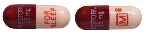Imprinted "FOR SLEEP" on one side, other side boxed "M"® in red. Maroon cap imprinted "RESTORIL 15 mg" twice in white |